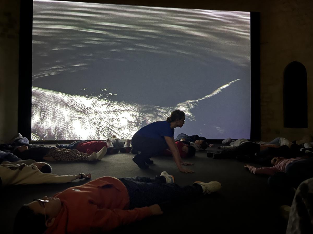 L’œuvre de Tania Mouraud Ad Infinitum, exposée à la tour de la Chaîne**, a constitué le point de départ de ce projet. Cette vidéo, qui capte les mouvements amples des baleines apprenant à leurs petits à nager contre le courant pour rejoindre les côtes de l’Alaska, offre un matériau sensible et poétique pour initier une réflexion artistique, corporelle et sensorielle. Accompagné·e·s par Clémentine et Églantine Bart, les élèves ont été invités à explorer cette œuvre à travers le prisme du mouvement et de la mémoire des lieux patrimoniaux.